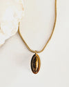 This sleek design features a genuine tiger's eye gemstone with stunning golden-brown chatoyant bands, set in a polished 18k gold oval frame on a luxurious snake chain.